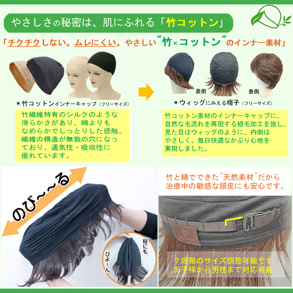 クールな肌触りの竹コットンインナーキャップに、ふわっと毛髪をつけた、ウィッグのようにみえる医療用帽子です。帽子部分は、通気性がよく、伸縮性もある竹コットンインナーキャップを使用。7段階調整アダプター付きですので、頭の小さなお子様から男性まで対応可能です。